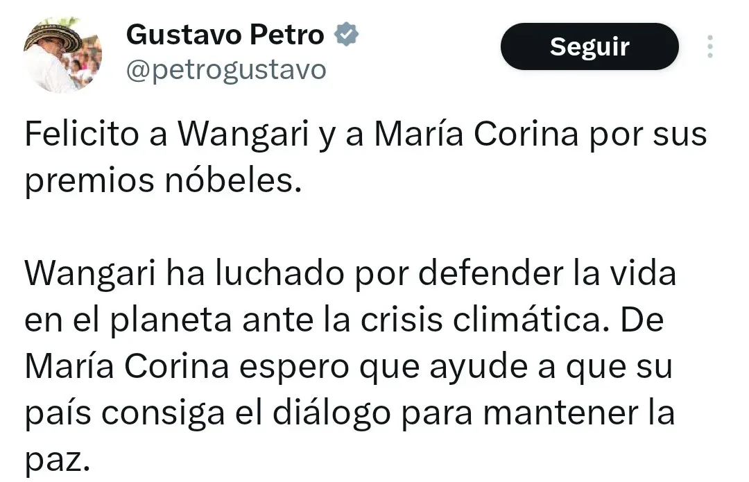En su publicación, Petro escribió: “Felicito a Wangari y a María Corina por sus premios nóbeles. Wangari ha luchado por defender la vida en el planeta ante la crisis climática. De María Corina espero que ayude a que su país consiga el diálogo para mantener la paz”. El mensaje hace referencia a Wangari Maathai, la activista keniana que recibió el Nobel de la Paz en 2004 y quien falleció en 2011 debido a un cáncer. Esta inclusión surgió aparentemente en respuesta a un tuit previo de la cuenta oficial del Premio Nobel que recordaba la labor de Maathai, pero ha sido calificada por críticos como un desliz que revela ignorancia o un esfuerzo por diluir el reconocimiento a Machado, quien fue premiada por su lucha en favor de la democracia en Venezuela.